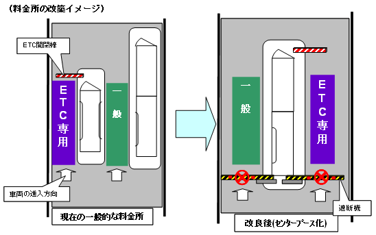 この度、収受員のレーン横断を回避し、お客様により安全にご利用いただくために、4月1日からセンターブース化(下図)など料金所施設の改築工事を順次実施してまいります。お客様には工事期間中、料金所の閉鎖などにより大変ご不便をおかけしますが、ご理解とご協力をお願い申し上げます。(入口の通行止め等工事の詳細については、弊社ホームページ、チラシ、ポスター、横断幕、ラジオ放送等でお知らせいたします。)