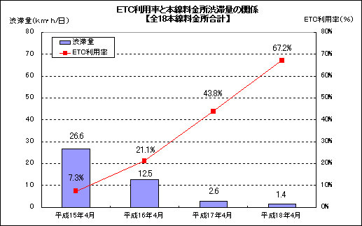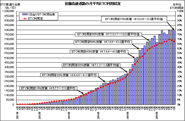 首都高速道路のETC利用率が、平成18年8月28日(月)から9月3日(日)までの週平均で70%を超えました。首都高の10台に7台はETC無線通行によるご利用となっています。 今後とも、ETCの普及に全力で取り組んで行きます。