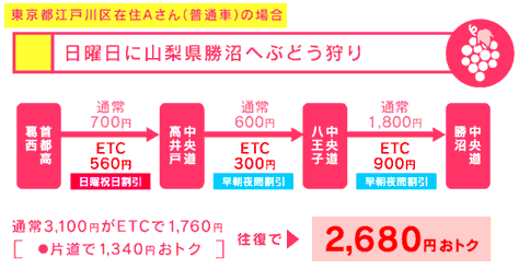 当社では、平日のオフピーク時や夜間及び休日(日曜日及び祝日)の通行料金を割引く『曜日別時間帯別割引』(3%~20%)を実施しています。 また、他の有料道路でも、様々なETC割引を実施しております。行楽の際に上手に使うとこんなにおトクです。