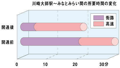 大師出入口新設により、川崎市臨海部と横浜市中心部が直結されます。浅田出入口~大師出入口の街路走行距離が約6km減少し、京急大師線川崎大師駅~みなとみらいの所要時間が30分から20分へと10分短縮します。