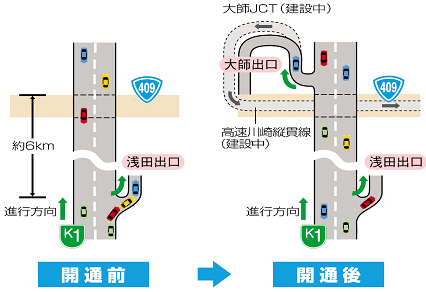 新しい大師出入口は国道409号と直結し、川崎市臨海部と横浜市中心部とのアクセスが強化され、利便性が大きく向上します。