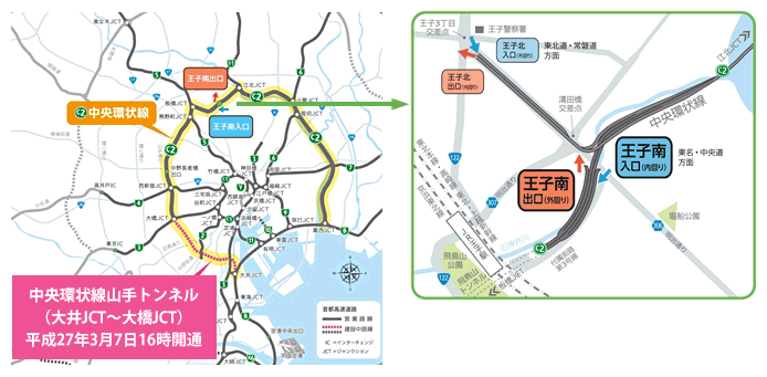 先立って3月7日に開通する中央環状線山手トンネル(大井JCT~大橋JCT)(中央環状品川線)と併せてお使い頂くことで、王子駅周辺と羽田空港などとのアクセスが向上するとともに、中央環状線と並行する明治通りなど周辺街路の混雑緩和が見込まれます。