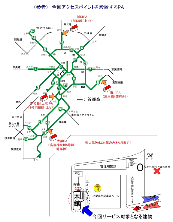 ①各PAの休憩所建物内で使用することができます。なお、大黒PAのベイサイドテラス二番館は、今回サービスを開始する建物には含まれておりません(本館のみとなります。)。